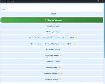 Luna AI Toolkit (BETA) is an Artificial Intelligence (AI)-based tool aimed at simplifying and accelerating the creative process and improving the performance of your content. Developed with a focus on ease of use and quality results, this toolkit offers a variety of features that can be tailored to specific you needs.